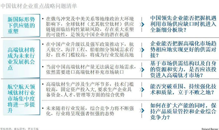 針對本文所提到的全新的國際和國內(nèi)形勢的綜合影響之下,結(jié)合鈦材行業(yè)特點,羅蘭貝格認(rèn)為相關(guān)中國企業(yè)應(yīng)該針對以下問題進行主動思考,順應(yīng)行業(yè)的整體發(fā)展趨勢,把握新的發(fā)展機遇,進行業(yè)務(wù)的布局和調(diào)整,占領(lǐng)先機、實現(xiàn)發(fā)展。